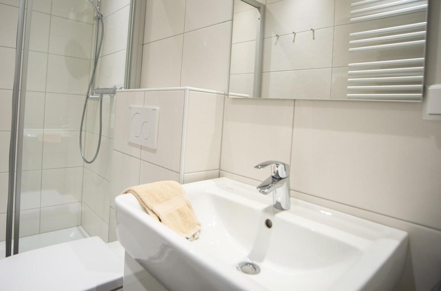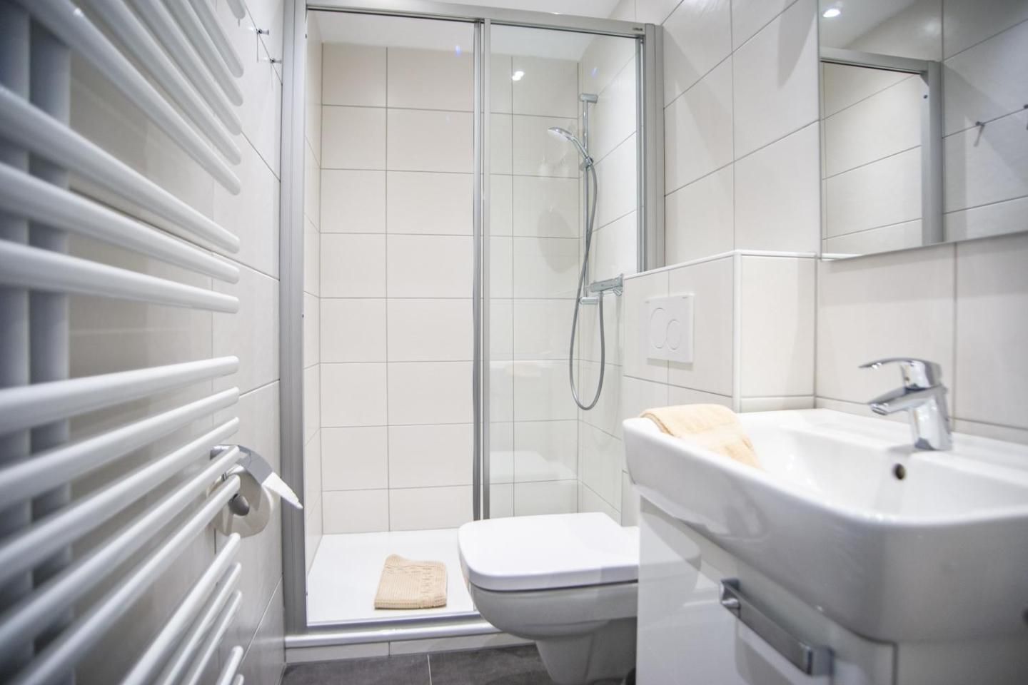 Helles Bad modern mit Dusche, WC,Handtuchheizkörper und Fön ausgestattet.