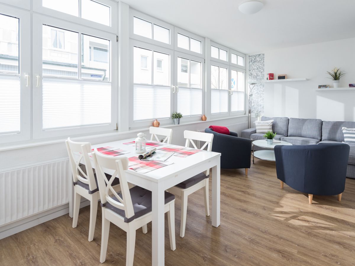 49 m² große, sonnige und moderne 3 Zimmer Ferienwohnung. Strand-und zentrumsnah. Freundlich eingerichteter Wohn Essbereich mit Kabel TV, Couchecke mit Ecksofa und zwei Sesseln, Essbereich mit ausziehbarem Esstisch.