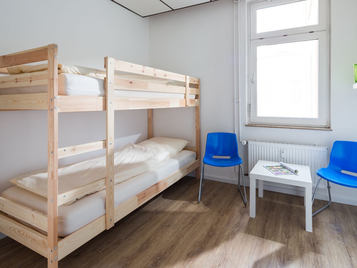 Innenliegendes Schlafzimmer mit Doppelbett (180x200) mit Kleiderschrank. Großes Kinderzimmer mit Etagenbett (90x 200), Kleiderschrank, Tisch und zwei Stühlen.
