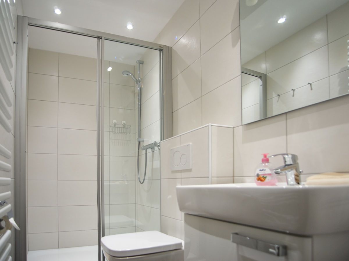 Helles Bad modern mit Dusche, WC, Handtuchheizkörper und Fön ausgestattet. Handtücher und Bettwäsche inklusive. Waschmaschine und Trockner im Haus verfügbar.