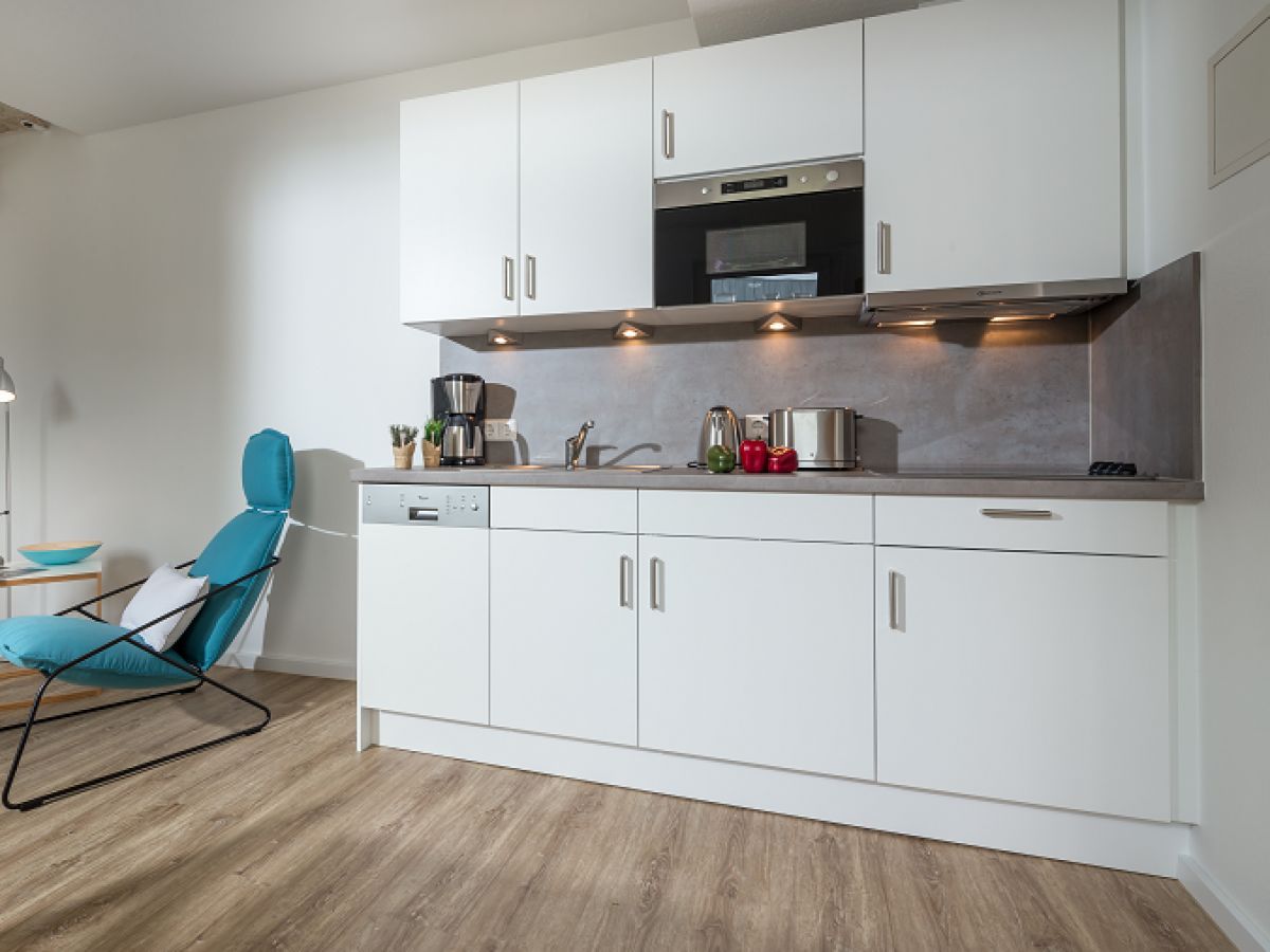 Freundlich eingerichteter Wohn Essbereich mit Kabel TV, Sitzecke mit zwei Sesseln, vollausgestattete moderne Küchenzeile, Esstisch mit zwei Stühlen.