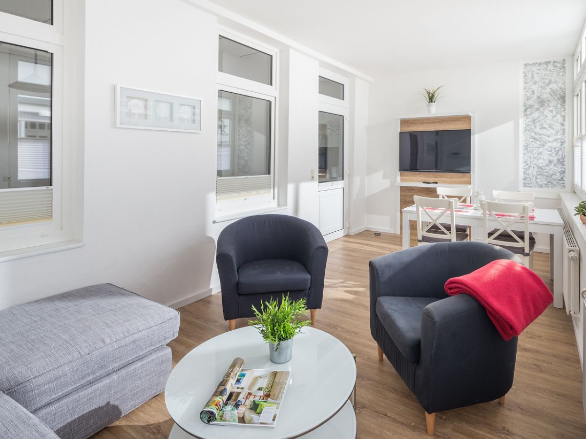 49 m² große, sonnige und moderne 3 Zimmer Ferienwohnung. Strand-und zentrumsnah. Freundlich eingerichteter Wohn Essbereich mit Kabel TV, Couchecke mit Ecksofa und zwei Sesseln, Essbereich mit ausziehbarem Esstisch.