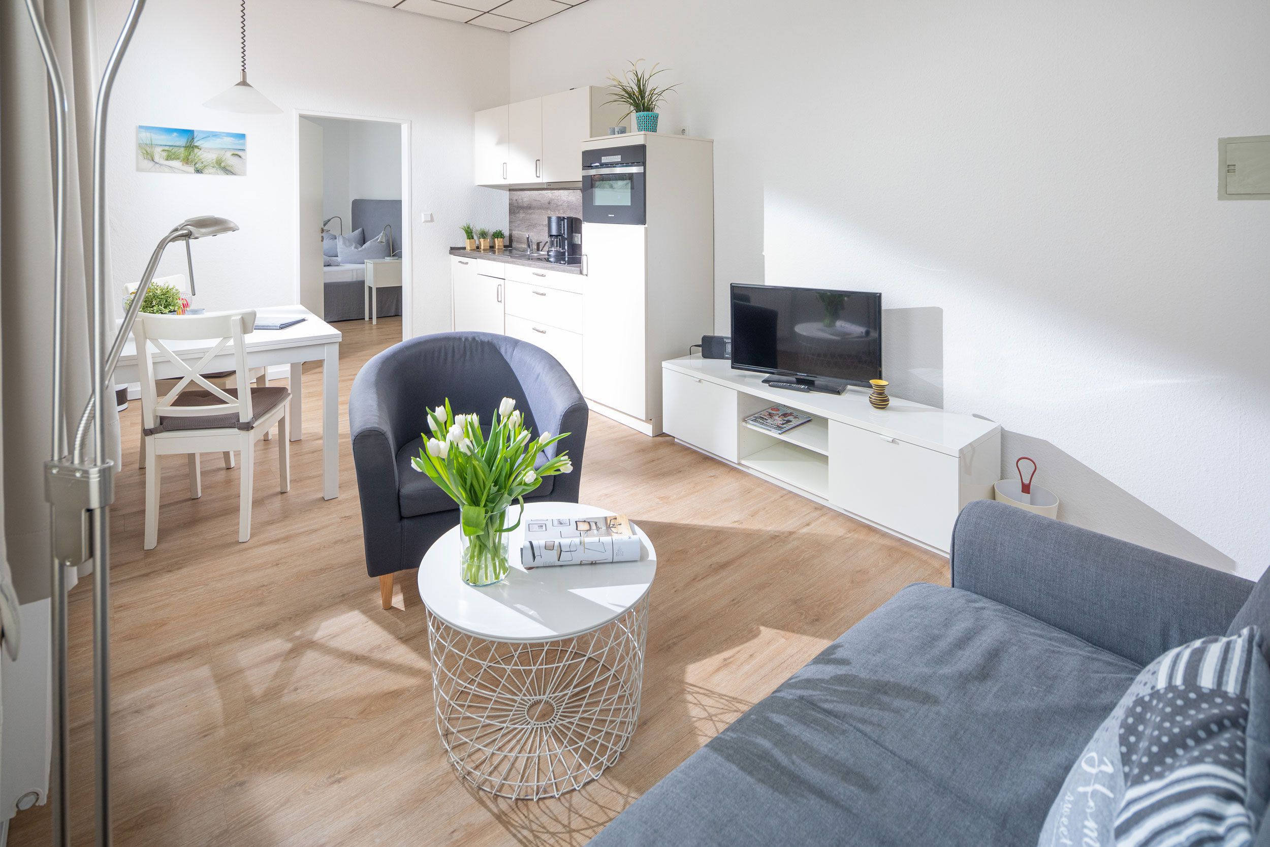 35 m² große, helle und moderne 2 Zimmer Ferienwohnung. Schnelles W-LAN. Strand- und zentrumsnah Freundlich eingerichteter Wohn Essbereich mit Kabel TV, Couch mit Sessel, vollausgestattete moderne Küchenzeile, Esstisch mit zwei Stühlen.