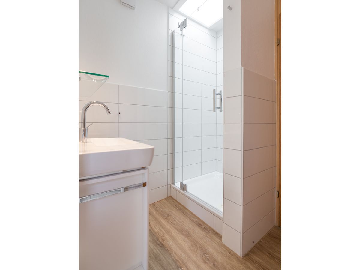 Helles Tageslichtbad modern mit Dusche, separatem WC, Handtuchheizkörper und Fön ausgestattet. Handtücher und Bettwäsche inklusive. Waschmaschine und Trockner im Haus verfügbar.